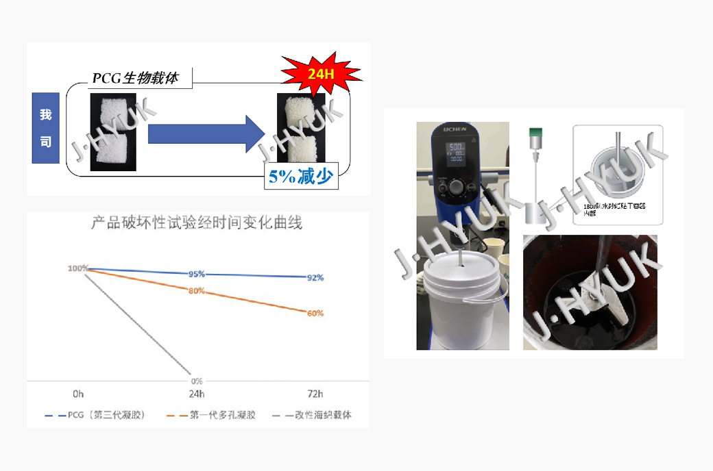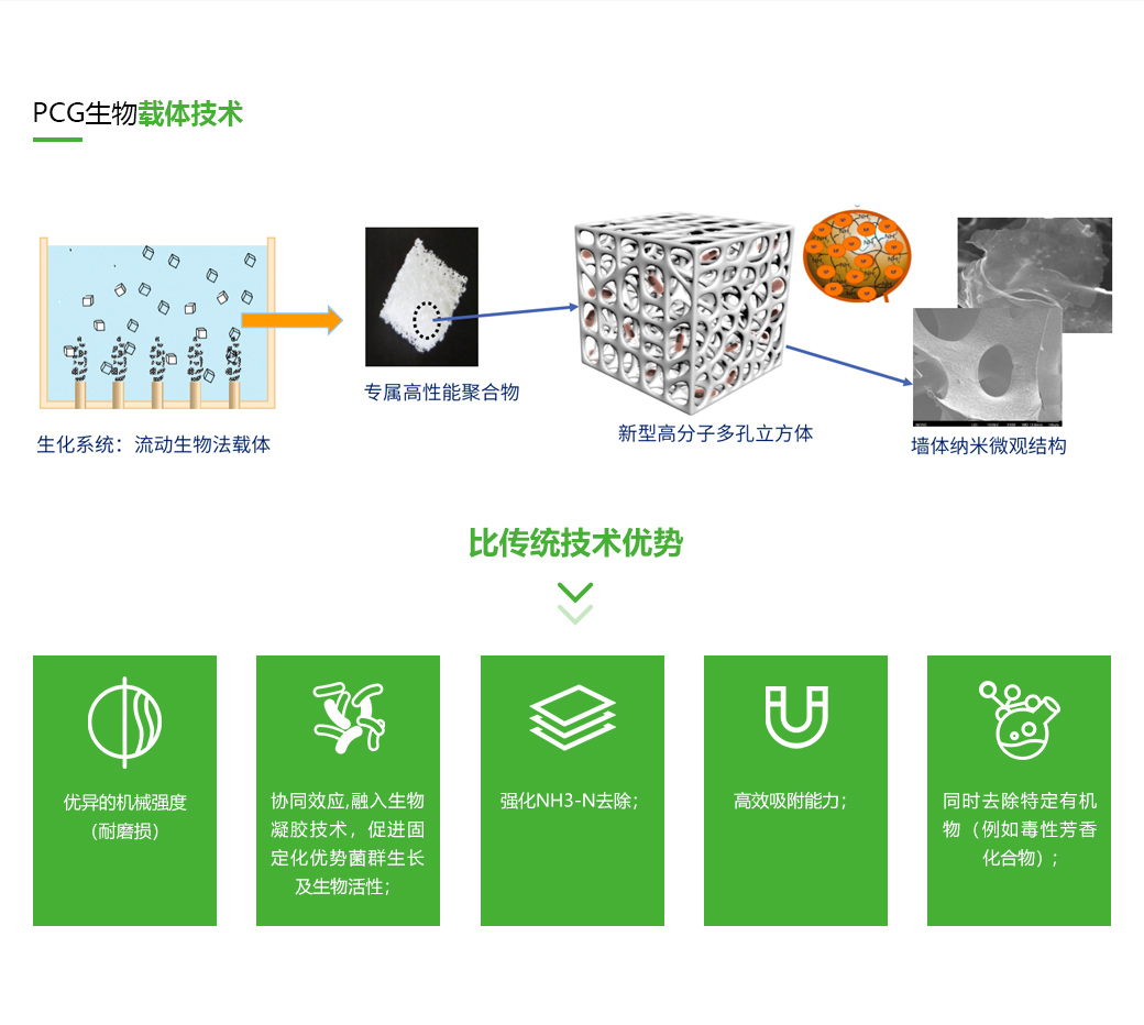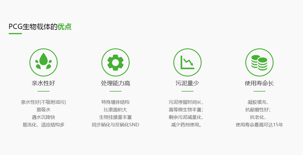 PCG是一種以高分子親水材料為基材的水處理生物載體產品,源自日本設計靈感,參考日本20年左右的應用經歷。我司技術研發團隊從2010年開始對軟性生物載體進行開發,經過6年的設計與開發,最終選擇以高親水性,生物親和性,抗磨損性,通氣性及強大的比表面積的高分子新材料作為生物載體的基材,并于2016年問世。歷經5年的小試與中試試驗,最終于2020年投入規模化生產。作為生物載體,PCG領先于國內同類型產品。